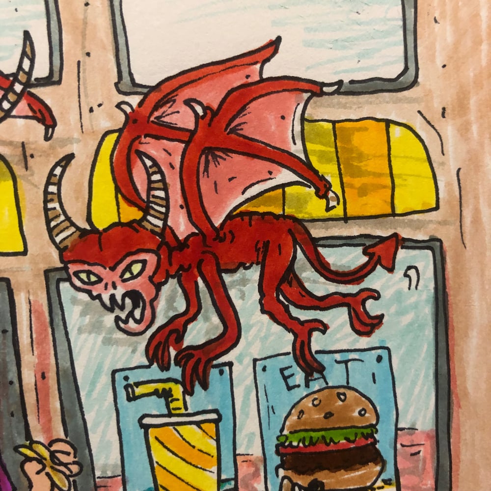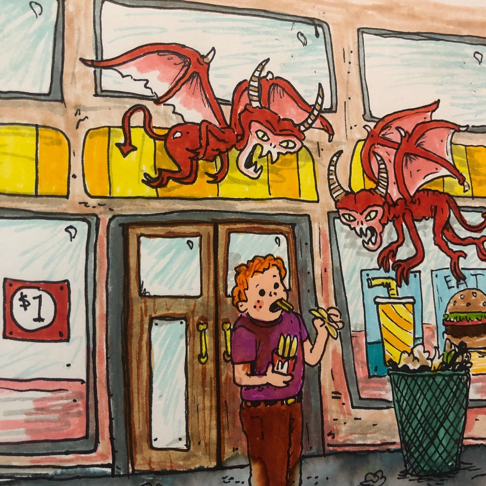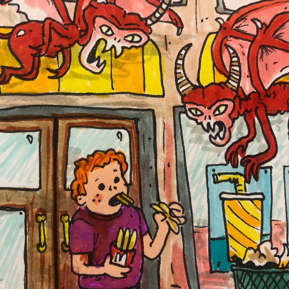 This is a one of a kind 7inch by 8 inch ink illustration on paper. The devil is in the fries. Temptation is everywhere.